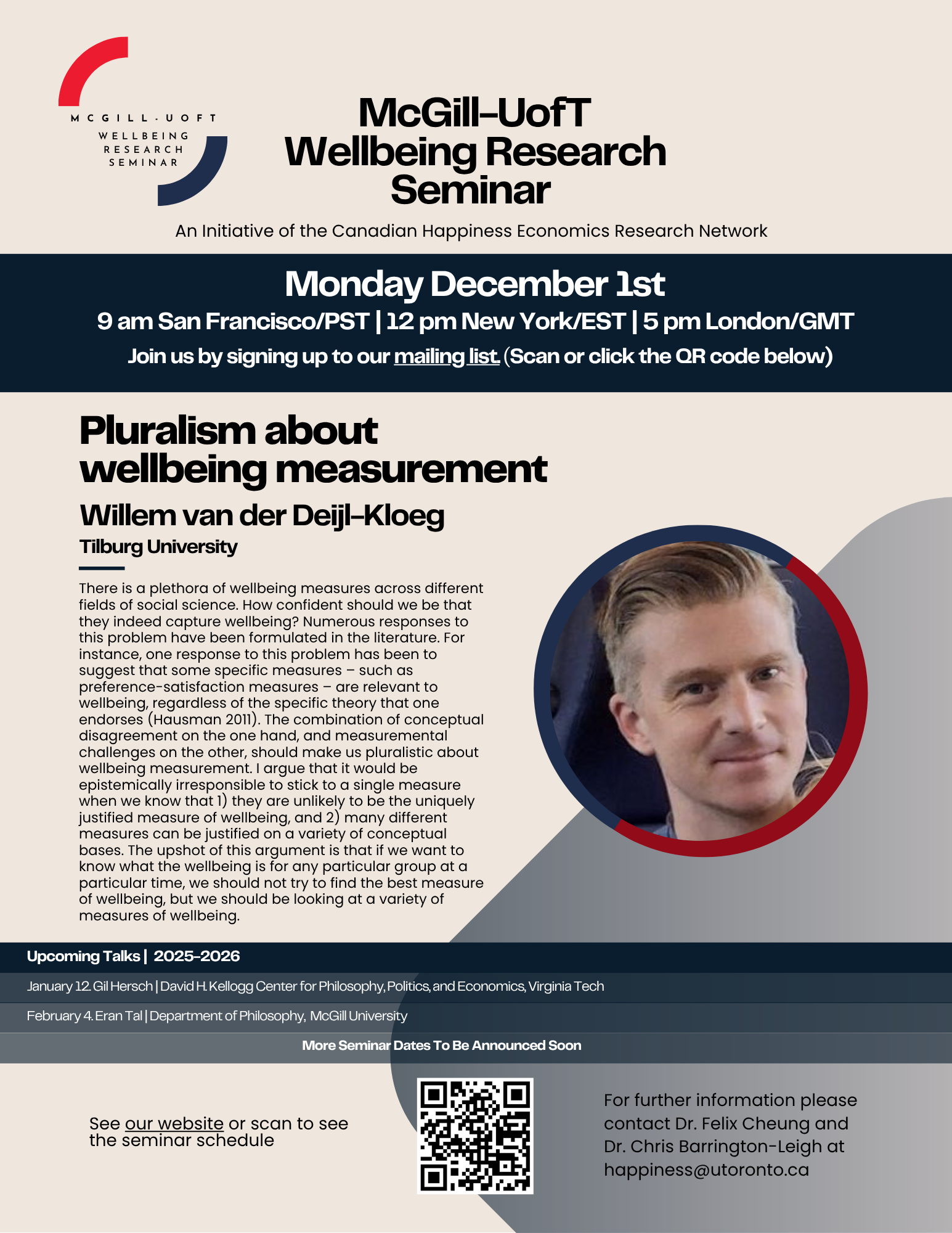 In addition to a number of dedicated and joint sessions at the annual CEA meetings since 2023, we are running an interdisciplinary seminar series on wellbeing research, co-hosted by McGill University and the University of Toronto, described below. We also host a mailing list (google group) for interested researchers, and have formal membership, at no cost, for CEA members. You can contact Chris Barrington-Leigh to sign up or join.